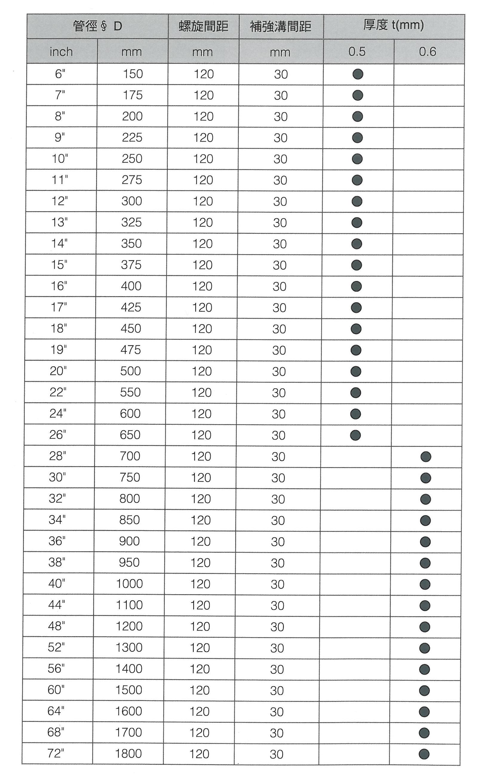 標準型螺旋風管規格表